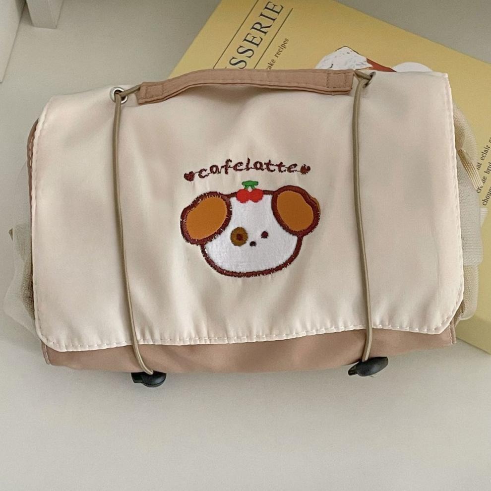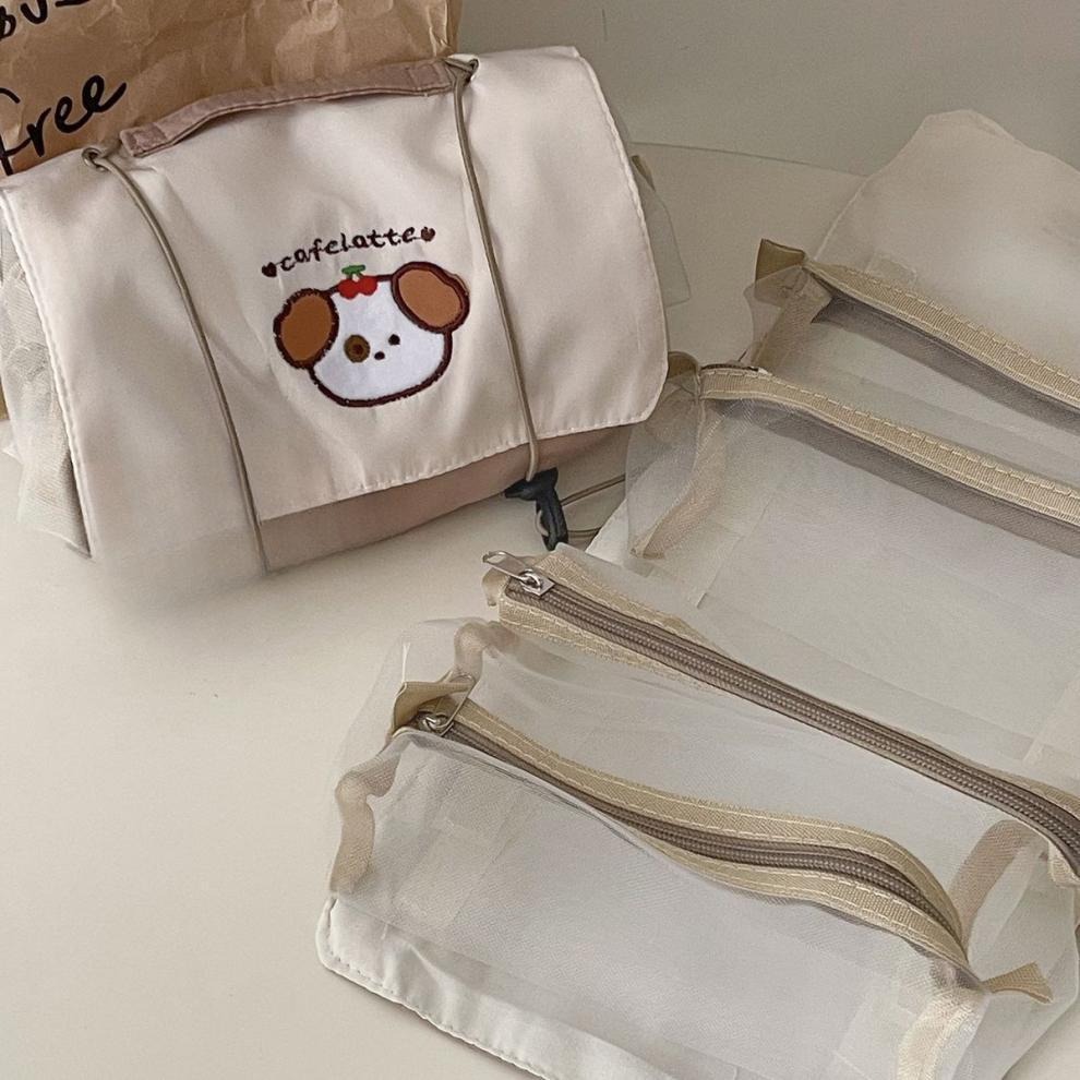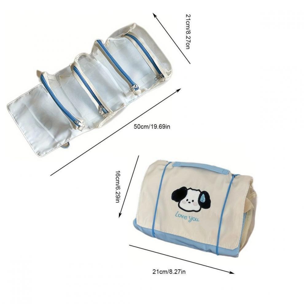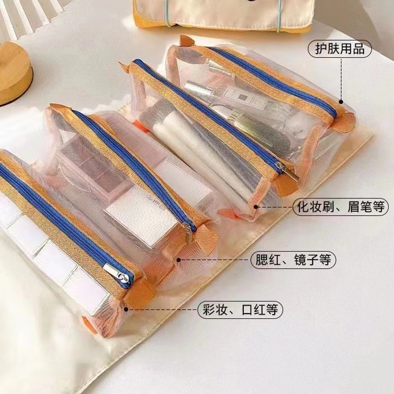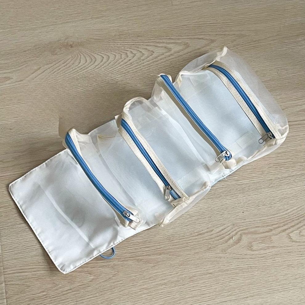Estuche organizador de útiles o materiales de viaje. Contiene 4 compartimentos.