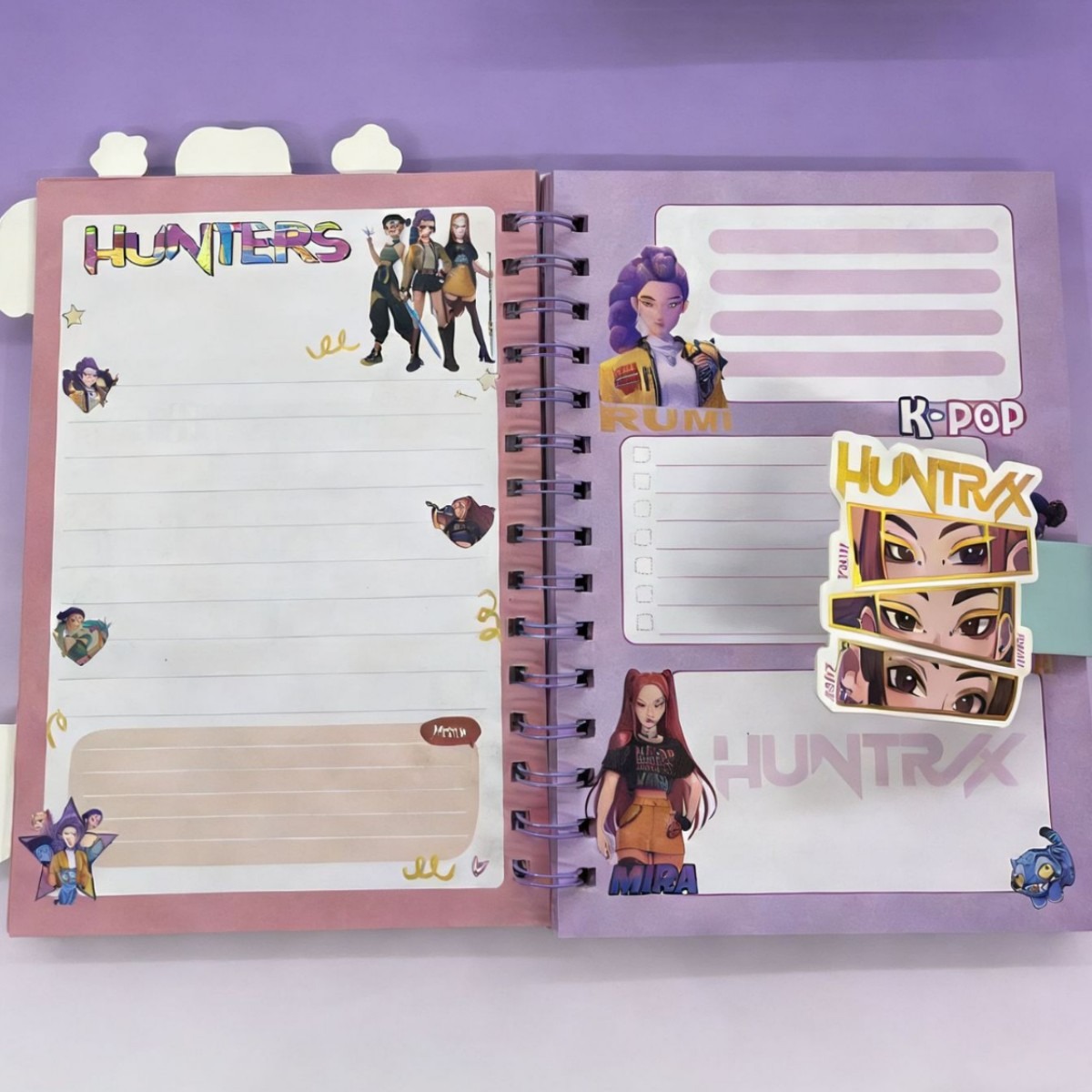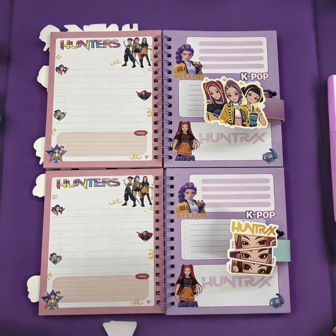 Libretas con hojas decoradas de temática Huntrix. Contiene 100 hojas.